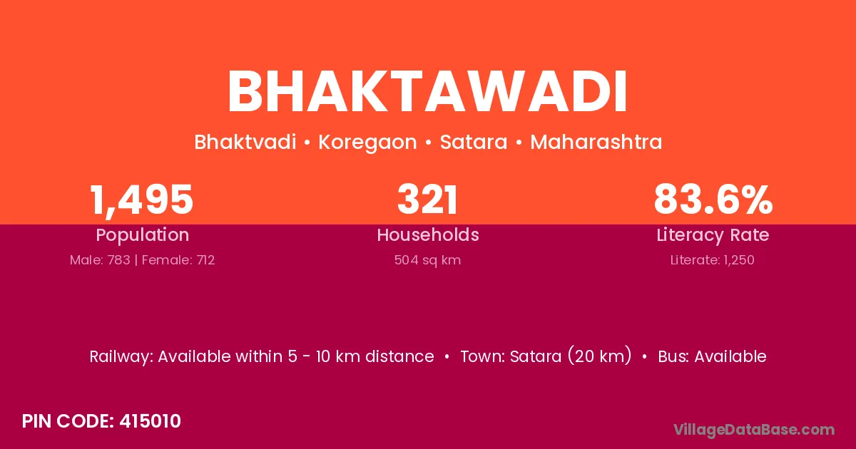 Bhaktawadi village has a total population of 1,495 people, of which 783 are males and 712 are females.