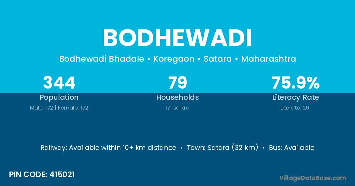 Satara (32 km) is the nearest town to Bodhewadi village for major economic activities and is located approximately 32 km away.