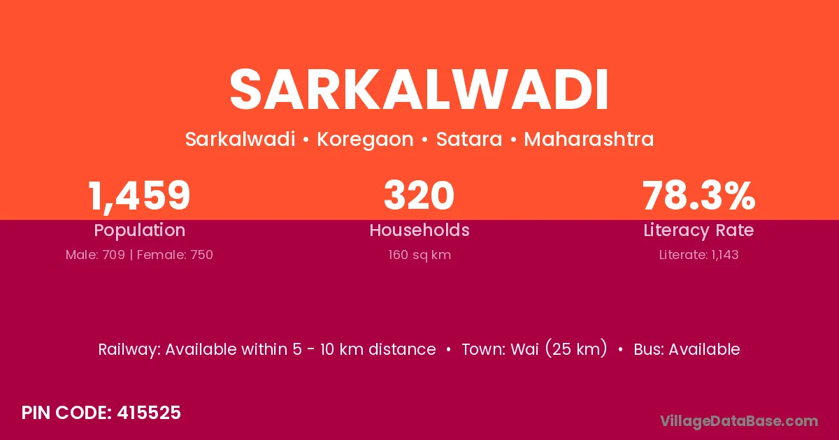 Wai (25 km) is the nearest town to Sarkalwadi village for major economic activities and is located approximately 25 km away.