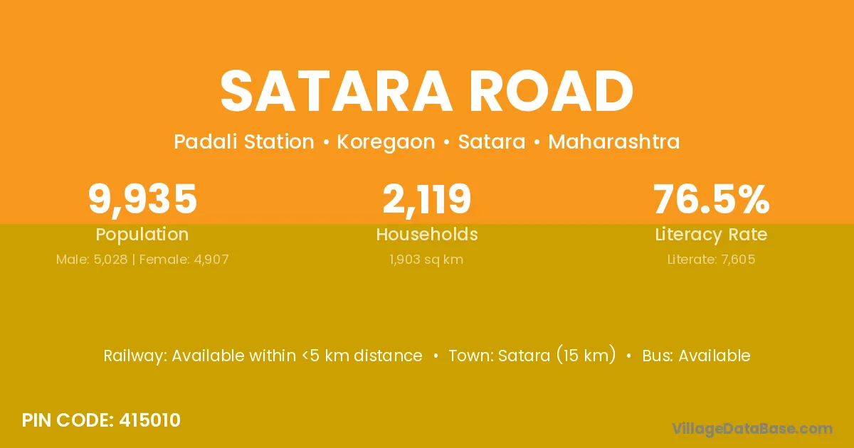 Satara Road village has a total population of 9,935 people, of which 5,028 are males and 4,907 are females.