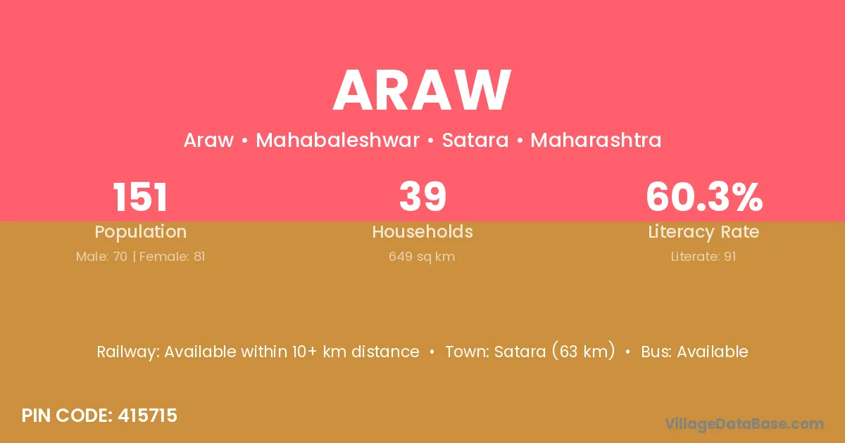 Satara (63 km) is the nearest town to Araw village for major economic activities and is located approximately 63 km away.