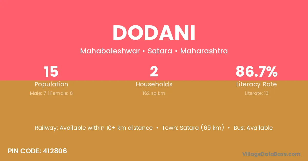 Satara (69 km) is the nearest town to Dodani village for major economic activities and is located approximately 69 km away.