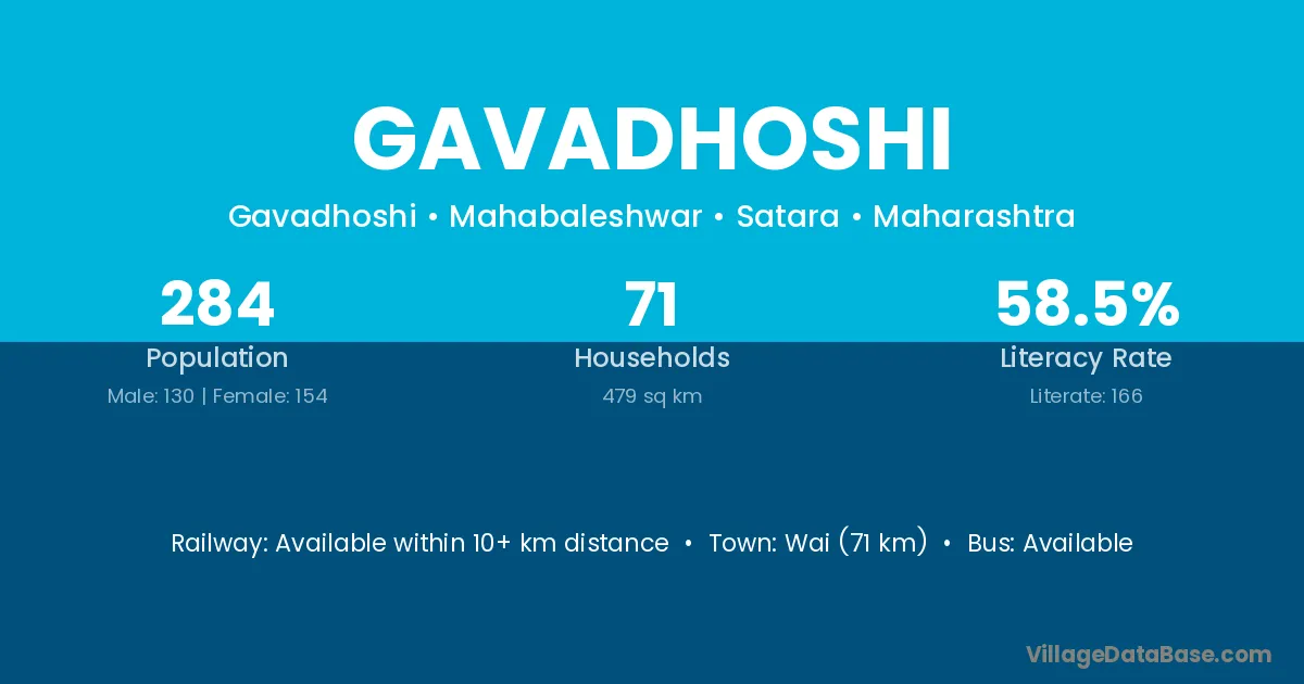 Wai (71 km) is the nearest town to Gavadhoshi village for major economic activities and is located approximately 71 km away.