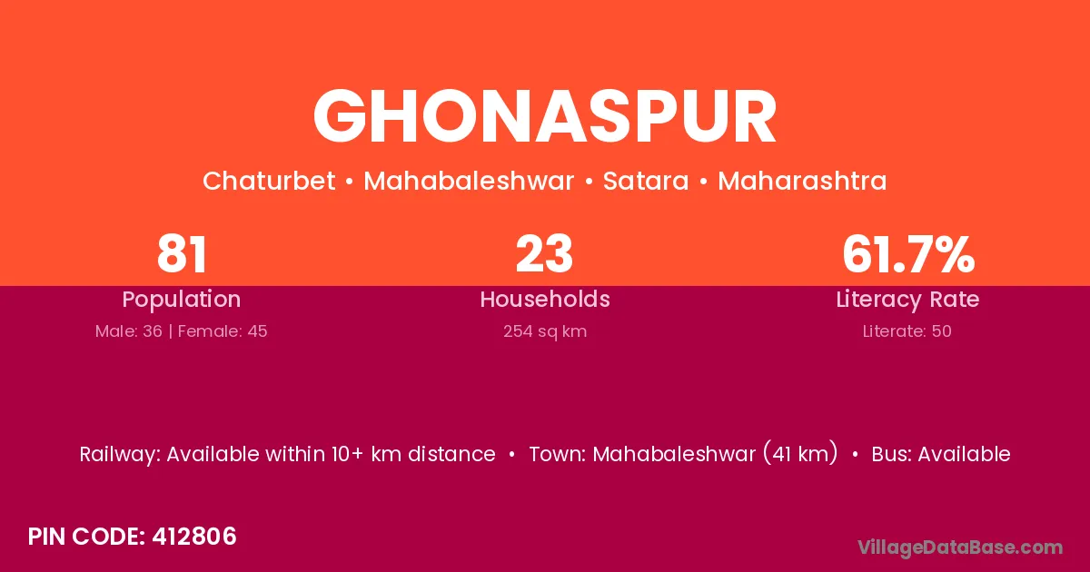 Mahabaleshwar (41 km) is the nearest town to Ghonaspur village for major economic activities and is located approximately 41 km away.