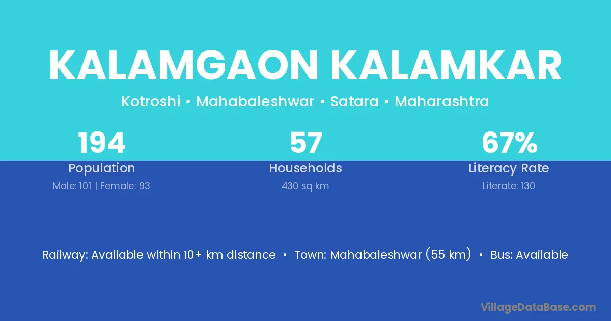 Mahabaleshwar (55 km) is the nearest town to Kalamgaon Kalamkar village for major economic activities and is located approximately 55 km away.