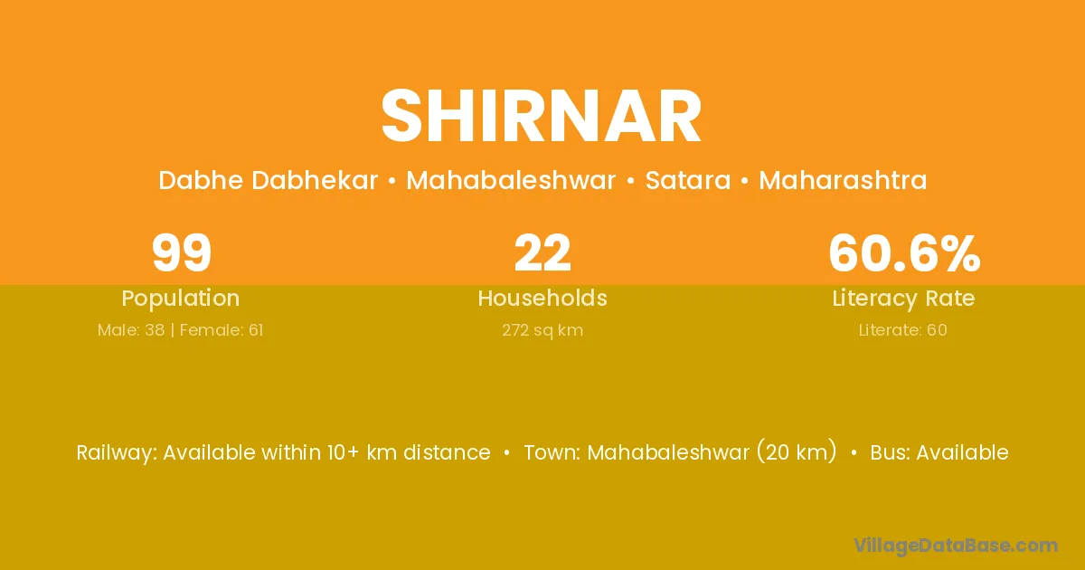 Mahabaleshwar (20 km) is the nearest town to Shirnar village for major economic activities and is located approximately 20 km away.