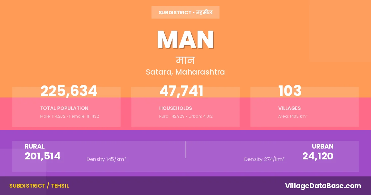 According to the 2011 census The total area of Man Tehsil is 1483 km², with a population of 225634 people. The population density is 152 inhabitants per square kilometre, and there are approximately 47741 houses in the sub district.