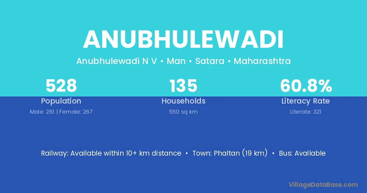 Anubhulewadi village has a total population of 528 people, of which 261 are males and 267 are females.