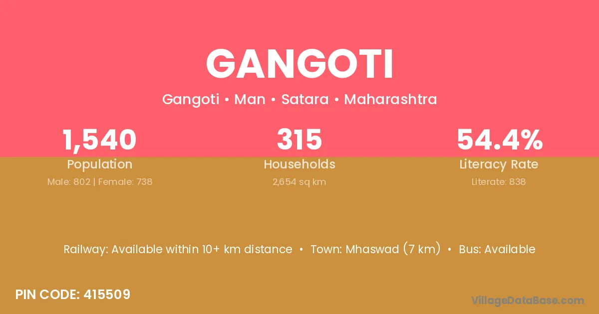 Mhaswad (7 km) is the nearest town to Gangoti village for major economic activities and is located approximately 7 km away.