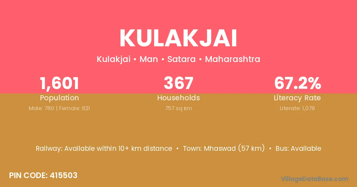 Mhaswad (57 km) is the nearest town to Kulakjai village for major economic activities and is located approximately 57 km away.