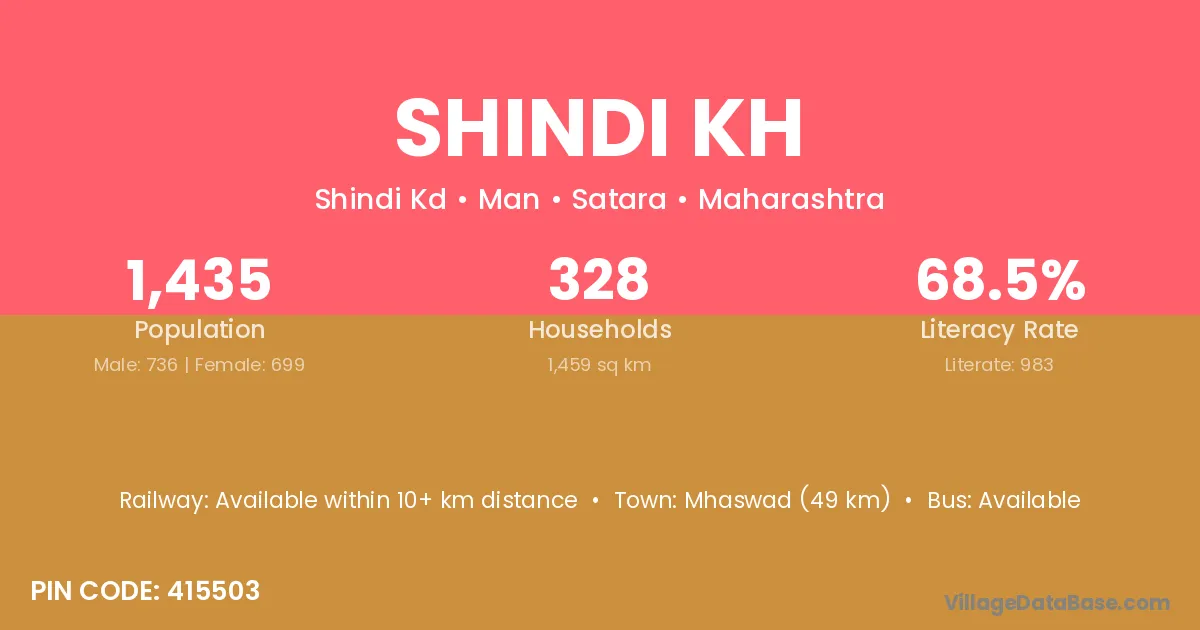 Mhaswad (49 km) is the nearest town to Shindi Kh village for major economic activities and is located approximately 49 km away.