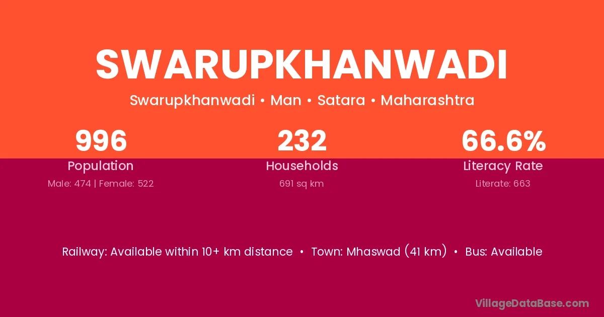 Swarupkhanwadi village has a total population of 996 people, of which 474 are males and 522 are females.