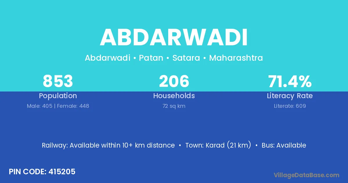 Karad (21 km) is the nearest town to Abdarwadi village for major economic activities and is located approximately 21 km away.