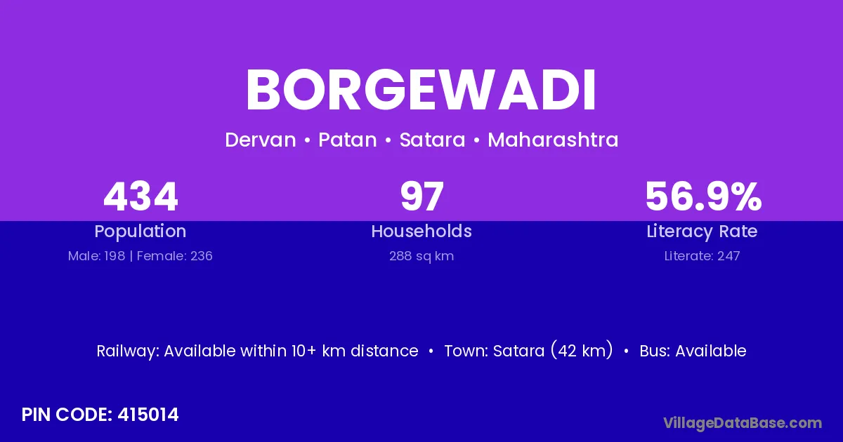 Satara (42 km) is the nearest town to Borgewadi village for major economic activities and is located approximately 42 km away.