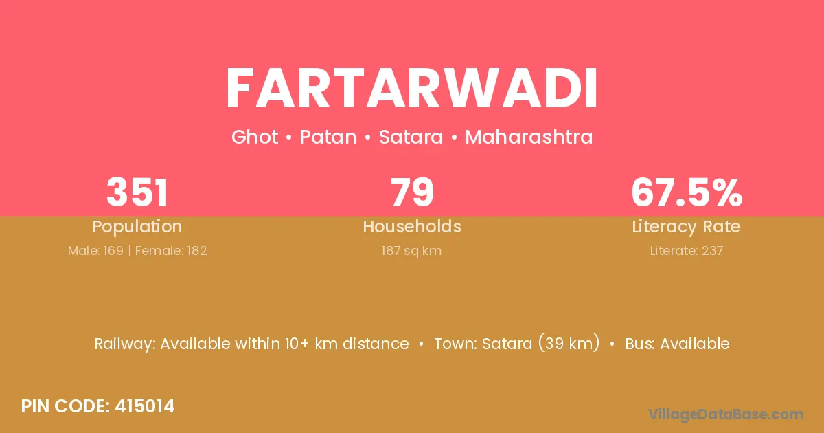 Satara (39 km) is the nearest town to Fartarwadi village for major economic activities and is located approximately 39 km away.
