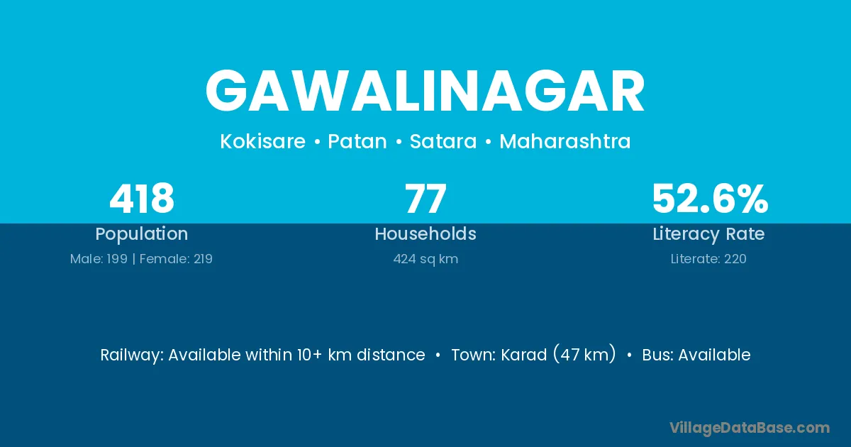 Karad (47 km) is the nearest town to Gawalinagar village for major economic activities and is located approximately 47 km away.