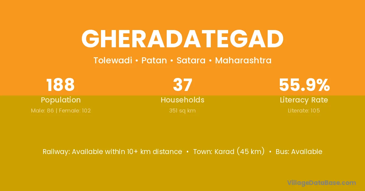 Karad (45 km) is the nearest town to Gheradategad village for major economic activities and is located approximately 45 km away.