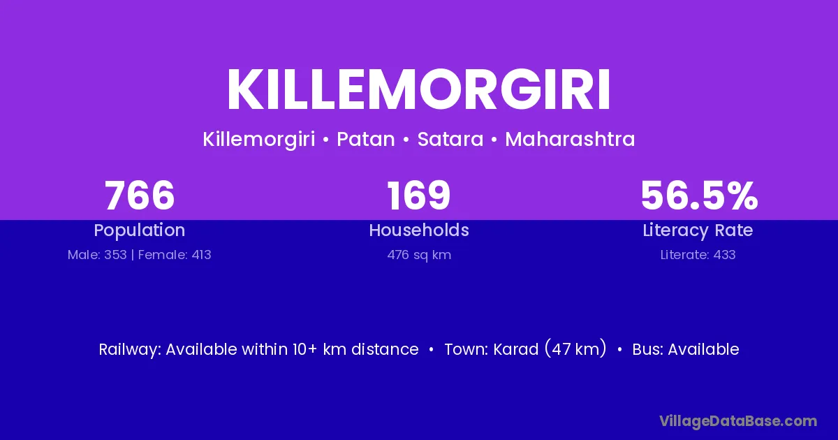 Karad (47 km) is the nearest town to Killemorgiri village for major economic activities and is located approximately 47 km away.