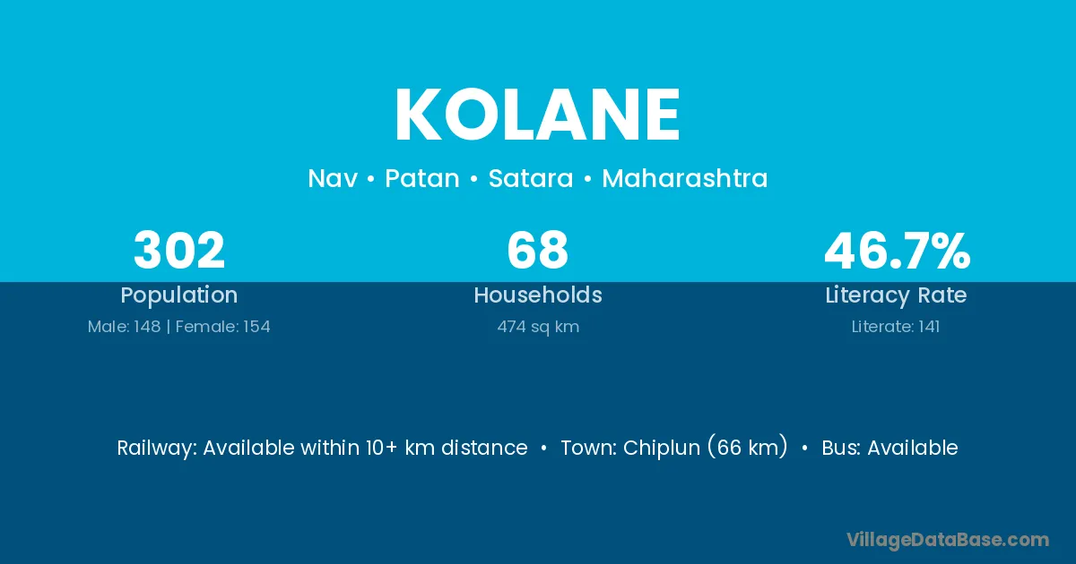 Chiplun (66 km) is the nearest town to Kolane village for major economic activities and is located approximately 66 km away.