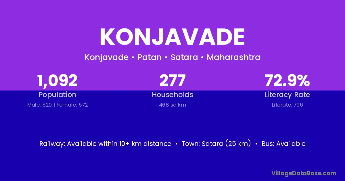 Satara (25 km) is the nearest town to Konjavade village for major economic activities and is located approximately 25 km away.