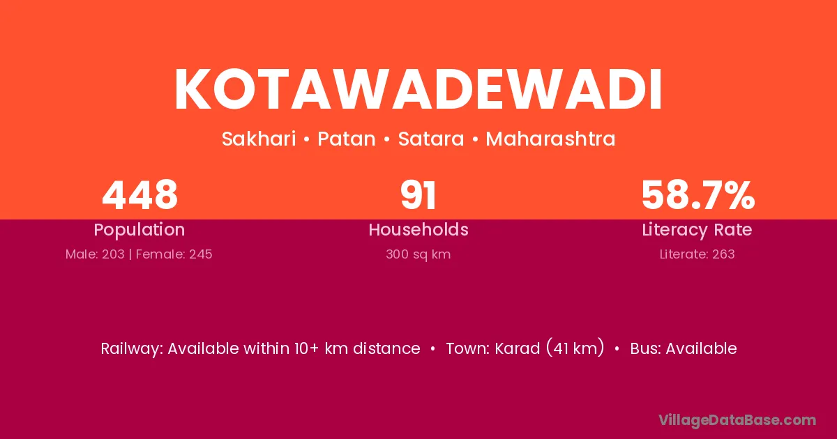 Kotawadewadi village has a total population of 448 people, of which 203 are males and 245 are females.
