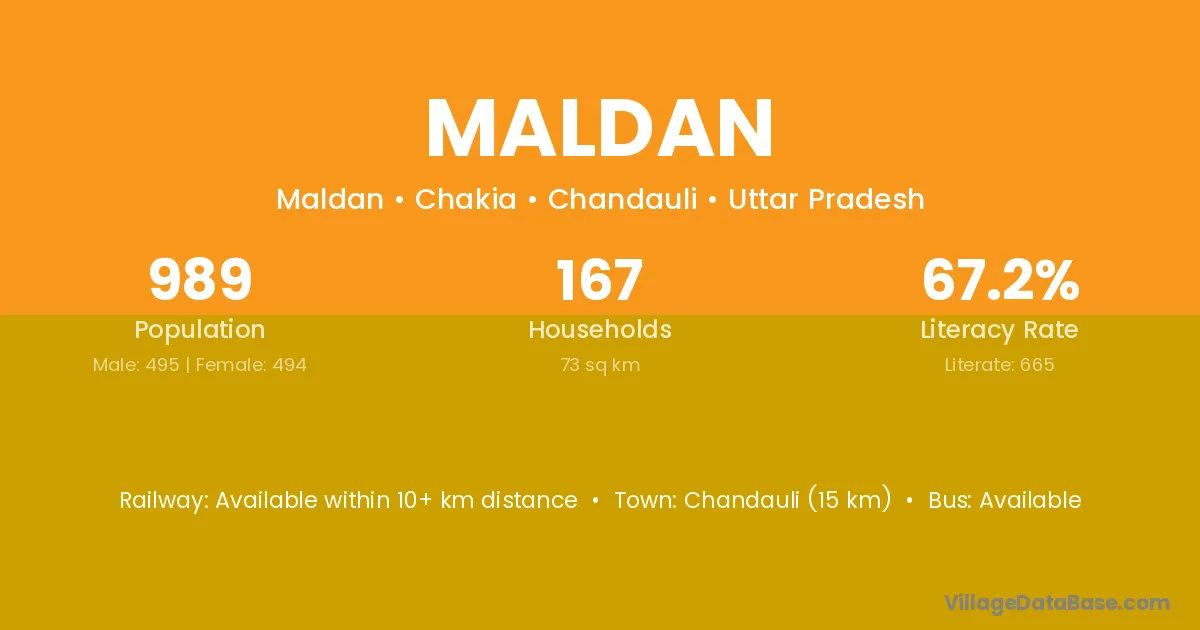 The literacy rate of Maldan village is 77.02%. Male literacy stands at 81.60% and female literacy at 72.85%.