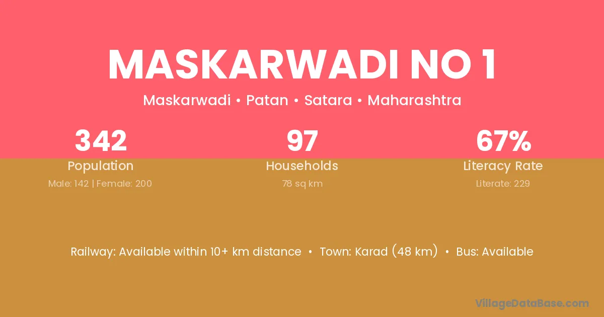 Karad (48 km) is the nearest town to Maskarwadi No 1 village for major economic activities and is located approximately 48 km away.