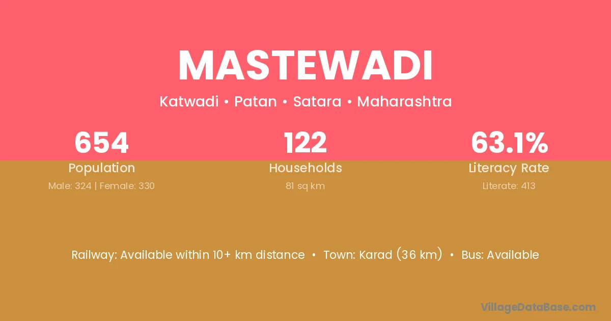 Karad (36 km) is the nearest town to Mastewadi village for major economic activities and is located approximately 36 km away.
