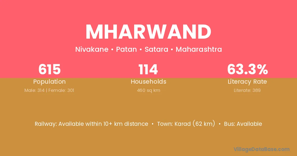 Karad (62 km) is the nearest town to Mharwand village for major economic activities and is located approximately 62 km away.