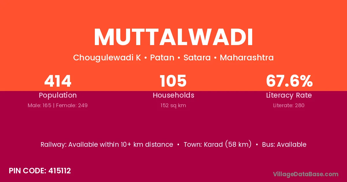 Muttalwadi village has a total population of 414 people, of which 165 are males and 249 are females.
