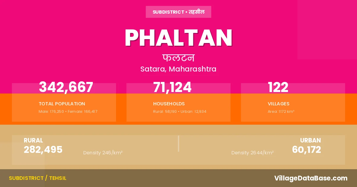 According to the 2011 census The total area of Phaltan Tehsil is 1172 km², with a population of 342667 people. The population density is 292 inhabitants per square kilometre, and there are approximately 71124 houses in the sub district.