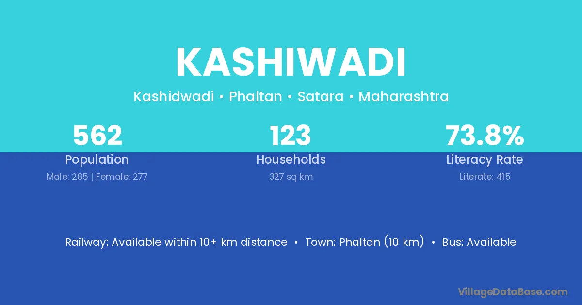 Phaltan (10 km) is the nearest town to Kashiwadi village for major economic activities and is located approximately 10 km away.