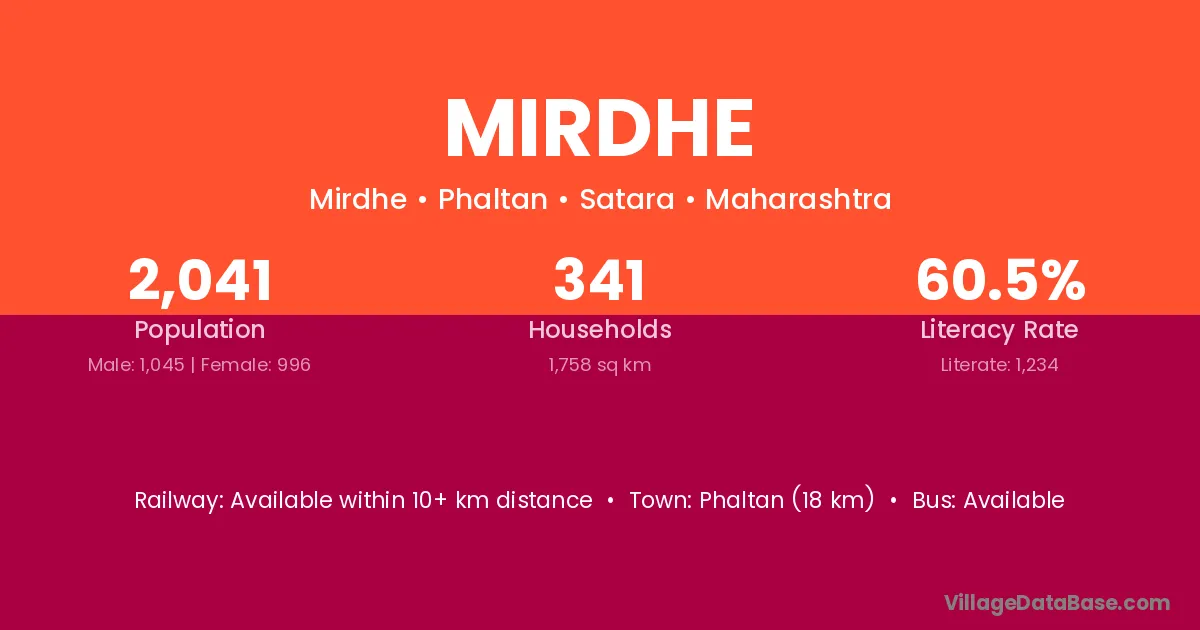 Phaltan (18 km) is the nearest town to Mirdhe village for major economic activities and is located approximately 18 km away.