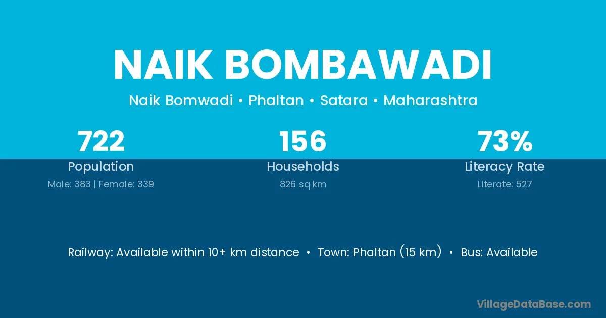 Phaltan (15 km) is the nearest town to Naik Bombawadi village for major economic activities and is located approximately 15 km away.