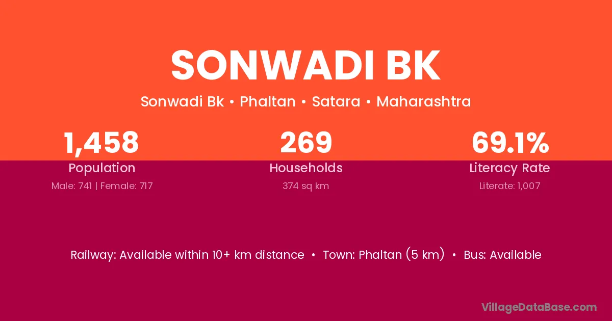 Sonwadi Bk village has a total population of 1,458 people, of which 741 are males and 717 are females.