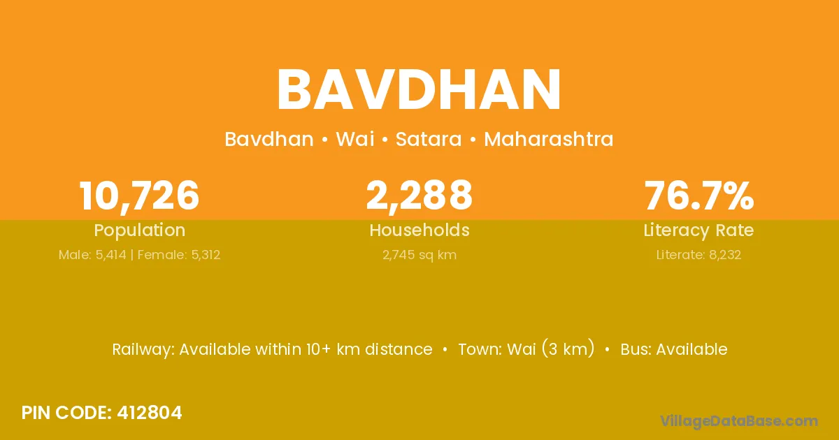 Wai (3 km) is the nearest town to Bavdhan village for major economic activities and is located approximately 3 km away.