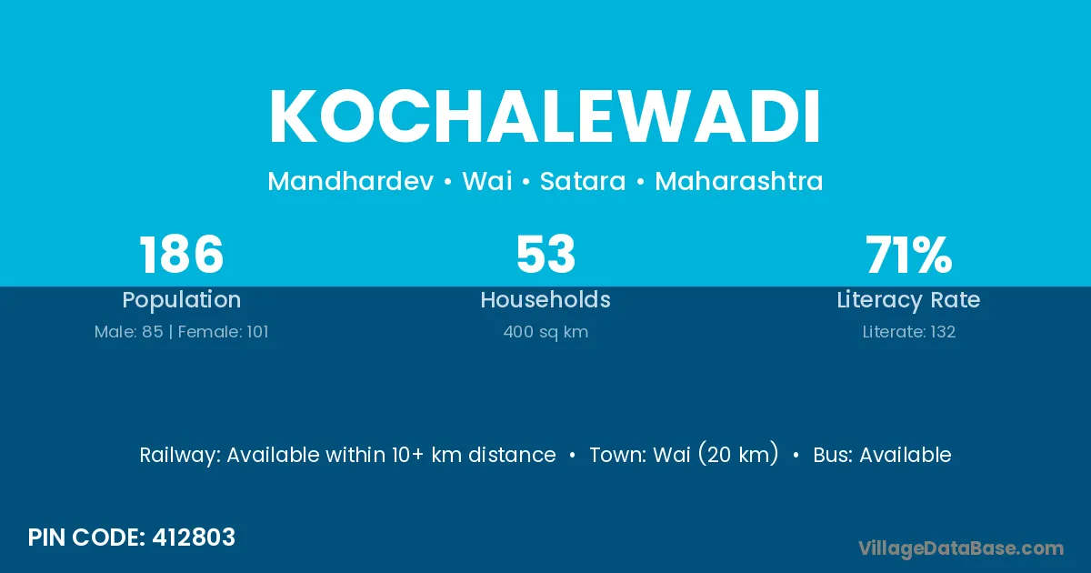 Wai (20 km) is the nearest town to Kochalewadi village for major economic activities and is located approximately 20 km away.