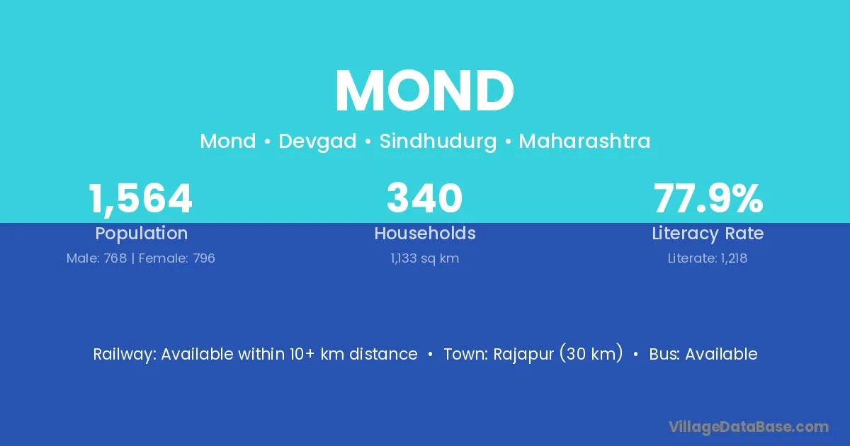 Rajapur (30 km) is the nearest town to Mond village for major economic activities and is located approximately 30 km away.