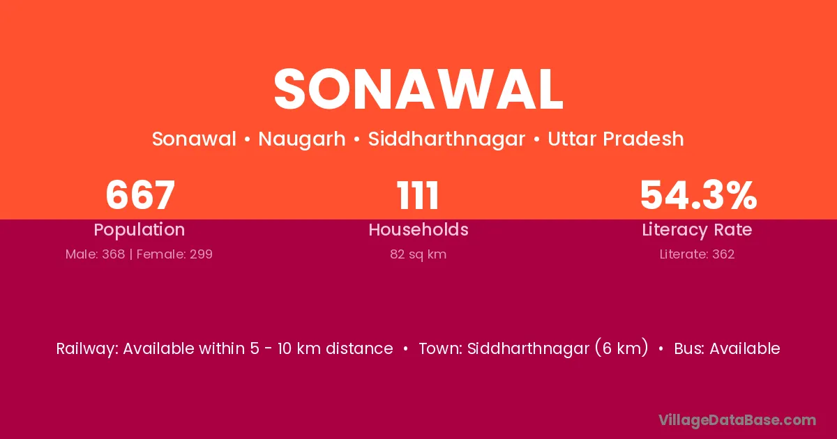 The literacy rate of Sonawal village is 78.45%. Male literacy stands at 84.19% and female literacy at 72.02%.
