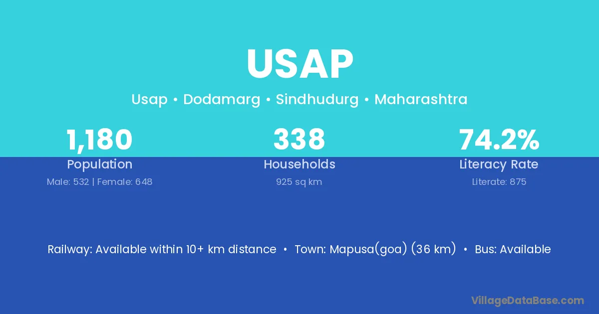 Mapusa(goa) (36 km) is the nearest town to Usap village for major economic activities and is located approximately 36 km away.