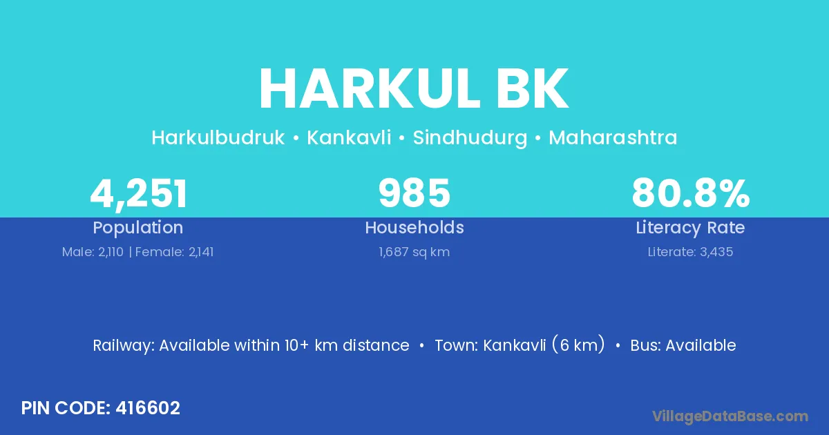 Kankavli (6 km) is the nearest town to Harkul Bk village for major economic activities and is located approximately 6 km away.