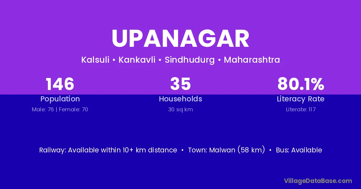 Malwan (58 km) is the nearest town to Upanagar village for major economic activities and is located approximately 58 km away.