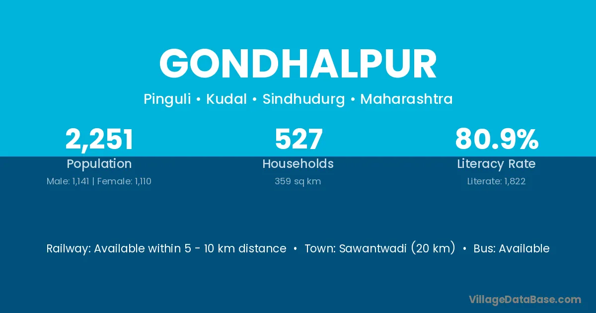 Sawantwadi (20 km) is the nearest town to Gondhalpur village for major economic activities and is located approximately 20 km away.