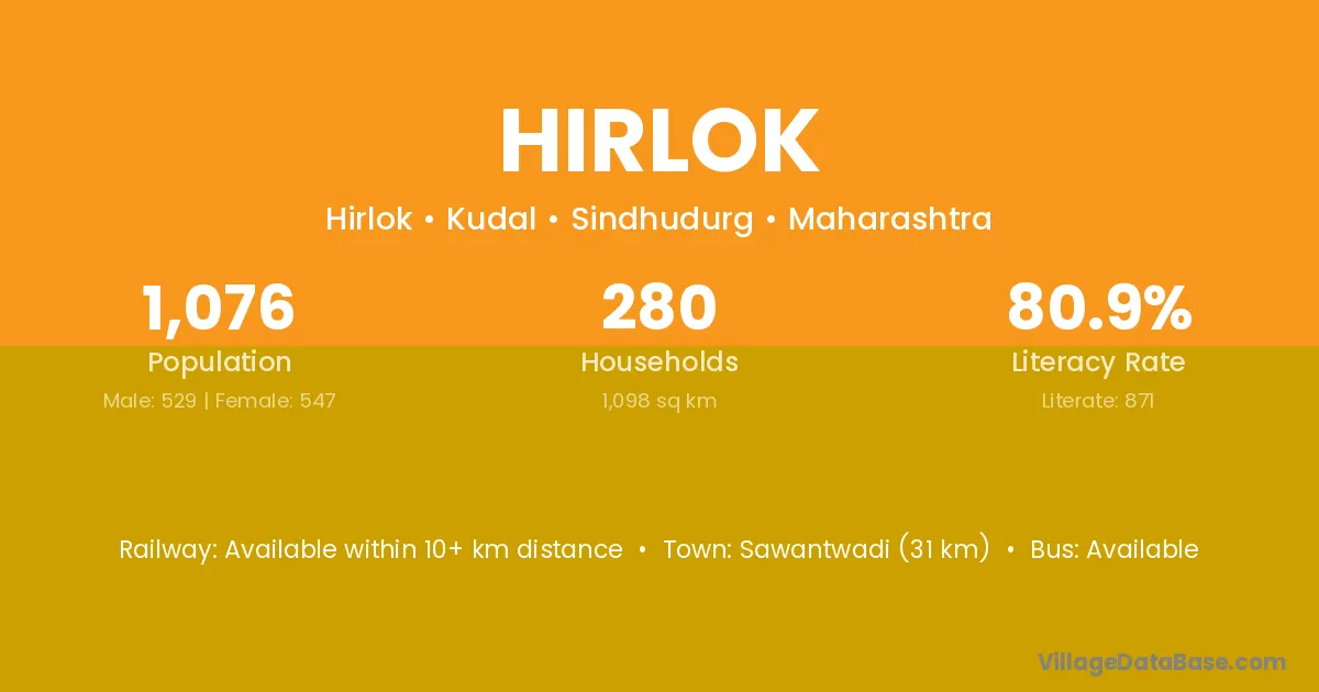 Sawantwadi (31 km) is the nearest town to Hirlok village for major economic activities and is located approximately 31 km away.