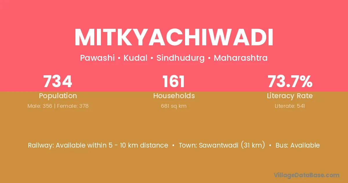 Sawantwadi (31 km) is the nearest town to Mitkyachiwadi village for major economic activities and is located approximately 31 km away.