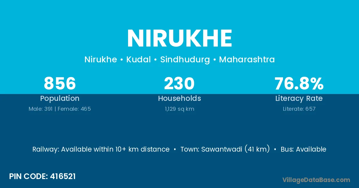 Sawantwadi (41 km) is the nearest town to Nirukhe village for major economic activities and is located approximately 41 km away.