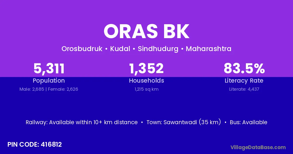 Sawantwadi (35 km) is the nearest town to Oras Bk village for major economic activities and is located approximately 35 km away.