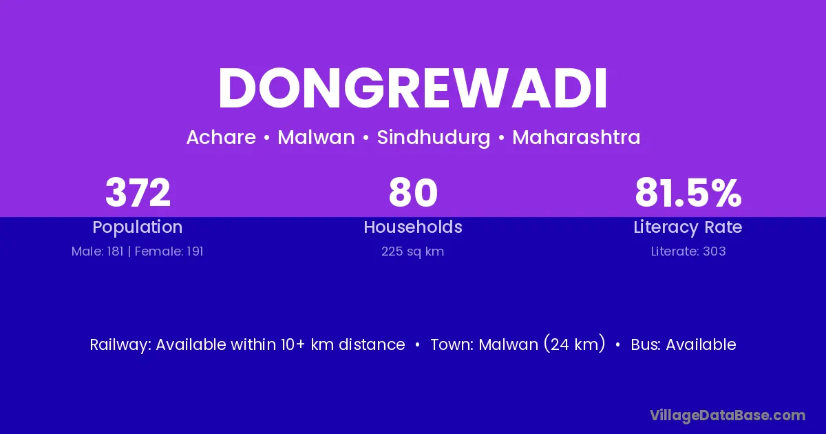 Malwan (24 km) is the nearest town to Dongrewadi village for major economic activities and is located approximately 24 km away.