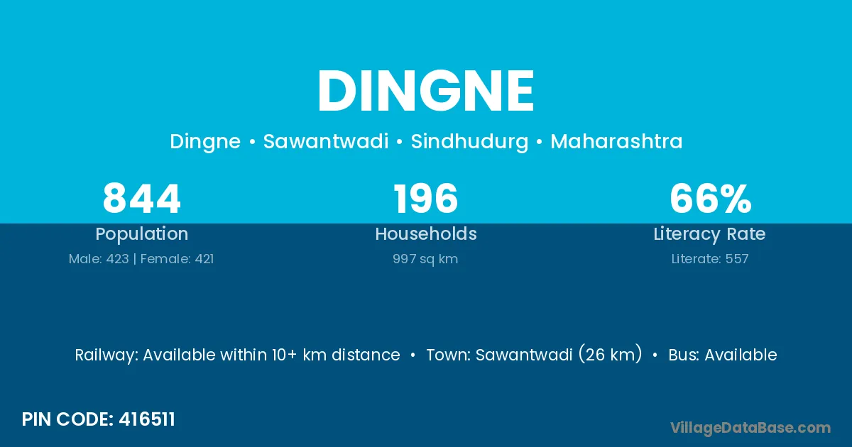 Sawantwadi (26 km) is the nearest town to Dingne village for major economic activities and is located approximately 26 km away.