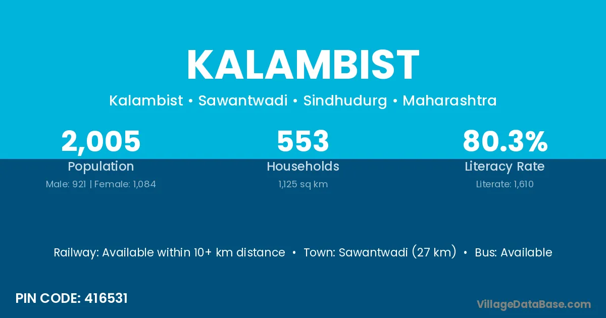 Sawantwadi (27 km) is the nearest town to Kalambist village for major economic activities and is located approximately 27 km away.